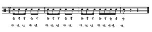“核心语汇”是一种学习传统打击乐种的新方法,可以更加全面地展现某一乐种丰富的节奏组合、音色搭配、声部逻辑等规律以及特有的演奏技术。其价值不仅在于提取,更在于转化,将传统元素转化为符合当代教学需求的内容,既保留文化根脉,又提升教学效率。具体而言,将民间乐曲中呈现的多种“核心语汇”依据音乐的发展,例如“散—慢—中一快”的脉络,拼贴或改编为一首或多首乐曲,这种“拼贴”能够最大程度地将某一乐种中形成的若干“核心语汇”组合在一起,由此突破传统教学法仅针对一两首乐曲学习以及认识浅显的现状。
