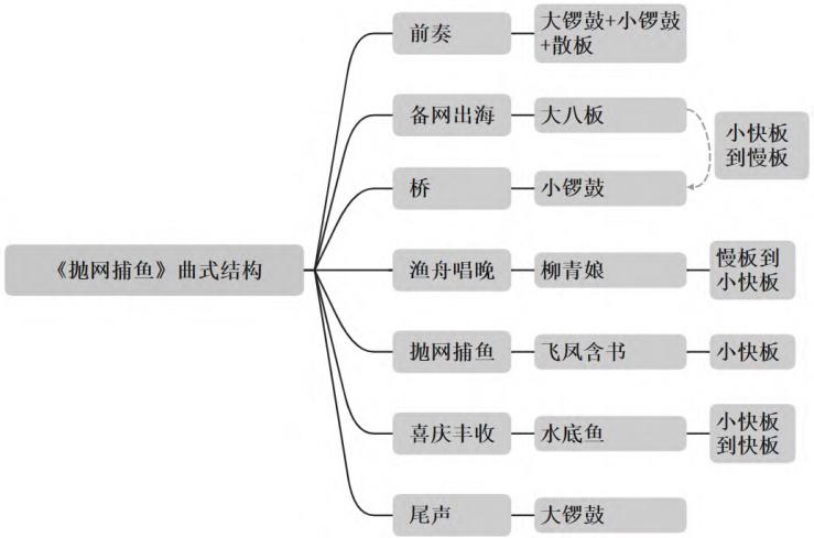 《抛网捕鱼》的调式为“轻三六调”,音阶为sol、la、do、re、mi、sol,乐曲的曲调比较轻松活跃。乐曲的整体是由五个部分组成的,分别是散板引子、《大八板》三板、《柳青娘》三板、《飞凤含书》《水底鱼》五个乐段组成,曲调流畅活泼、生动明快,描绘了渔民在海上捕鱼作业,获得丰收的喜悦心情。整体曲式结构见图1。