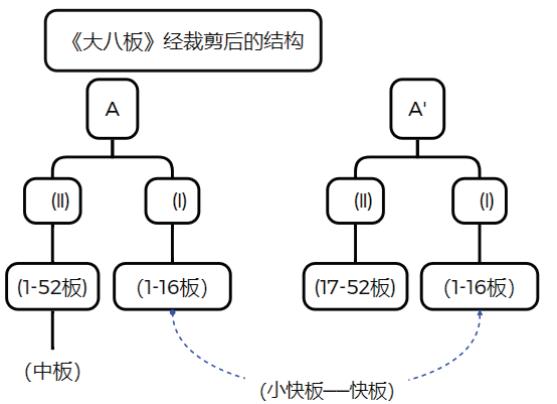 旋律多以三度进行,乐曲风格比较抒情、柔和。其中乐段《大八板》,分为三个段落,分别是八板头(1~16板)、八板中(17~53板)和八板尾(53~68板),但是这首曲子经过剪辑后,八板尾已经被删去,并将八板头与八板尾的位置进行了互换,大八板的曲式结构如图2。