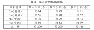 表1可见,作品中的三个乐章都包含有全部12个半音,但由于一支竹笛上的易奏音级有限,因而要求演奏者必须在演奏时运用半孔技术才能完成作品。由于各乐章选用了不同调的竹笛,因而半孔音级也有所不同。