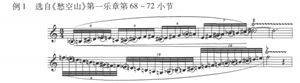 例1可见,在第68至69两小节中出现有11个变音,第71小节中含有9个变音,在快速跑动的9连音、10连音音阶中,如此集中的变音演奏,难度非比寻常。