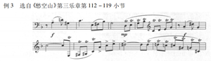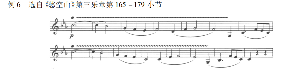 颤音是管乐演奏中极为常见的一种演奏技法,因而在管乐作品中出现颤音的演奏并不足为奇,而在《愁空山》中作曲家却赋予了颤音以最大限度的诠释。作品中共有 125 个音运用了颤音奏法,除第二乐章仅在第 75 小节出现一处颤音外,第一及第三乐章几乎通篇贯穿,如此大量的颤音运用极为少见。另外,有些颤音的用法也十分别开生面。