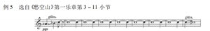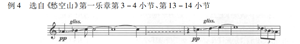 例4中的第3-4小节、第13-14小节分别为第一乐章前两乐句的起始部分,从滑音的用法看,并非是为了润色旋律而设。由于与两处滑音并行的全音距离的三音组是作为第一乐章的主题材料通篇贯穿的,因而滑音在此处扮演的角色也就得以升华,它不再是装饰性的附属而是主题材料的重要音乐要素之一。除这一滑音用法外,第一乐章的多处句尾也有滑音奉决出现,与句首主题的滑音形成回应,这更说明了滑音的重要作用。如此,在多处滑音的演奏中,则需细细体味其在音乐中的涵义,做到恰如其分的演绎,以表达作品的深层韵味。