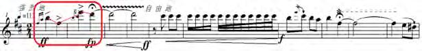 第二乐章《血洒孟良》的尾声为211~227小节。在尾声中,于216、221小节处零星出现了第二乐段中“节奏动机”的变形再现(谱例15),全曲经过一个13连音的密集时值的上行级进进行之后,全曲结束在E角音上。