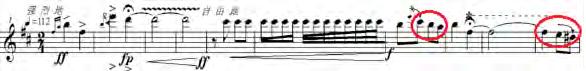 第三乐段为华彩乐段,二部结构,主奏部演奏旋律,协奏部演奏和声性伴奏。第一部分为106~121小节,第二部分为122~142小节。其中,第一部分可分为3个乐句:106~170为第一乐句,旋律动机由♯C羽运动至♯G角从而确立此处为♯C羽调(五度的主属进行确立调性)。111~115小节为第二乐句,旋律为第一乐句的上四度模仿,到达了下属调,变为由♯F商运动至♯C羽。所以第三乐段第一部分前两个乐句的调性走向为主(♯C羽)属(♯G角)下属(♯F商)主(♯C羽),调性感强烈。第三段第一部分第三乐句为116~121小节,运用民族调式中“清角为宫”的转调方式,转调至♯F羽调至♯C角的旋律动机。