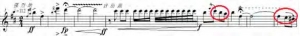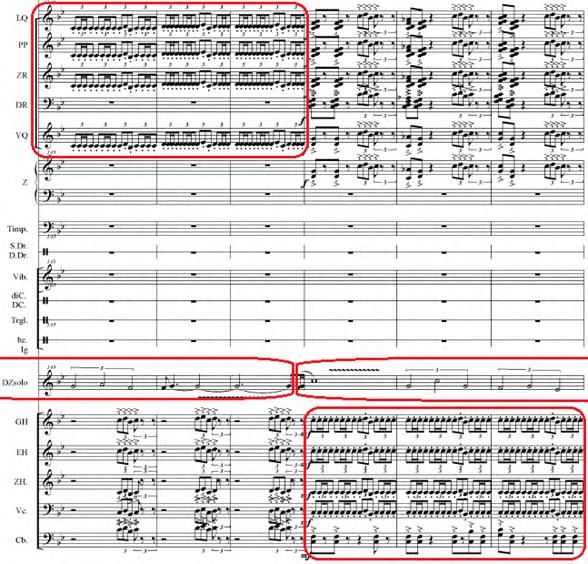 总得来看第三乐段,该乐段由两种动机分别发展为两部分,构成对比性的二部结构。该乐段音符密集,速度较快,采用模进的发展手法,表达出了紧张迫切的音乐情绪。第三乐段音乐的核心仍旧是主奏部,协奏部乐队还是根据主奏部的节奏配以和声。