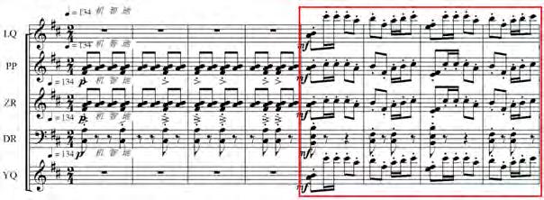 第四乐段主奏部旋律整体比较和缓而悠长,与第三乐段的密集音型的节奏产生对比。此时与主奏部旋律相配合的是协奏部演奏的音层式的音响背景,协奏部主要采用模进的方式演奏节奏密集的音,协奏部此处的节奏与第二乐段“节奏动机”很接近,为节奏动机的变形。