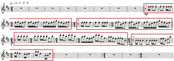 综合来看第一乐段,第一乐句中出现的两个动机,“折线动机”和“三音动机”,成为贯穿整个乐段的主导动机,整体呈现出先分别发展再综合再现的形式。并且通过后面的分析我们可以知道,这两个动机不仅贯穿了整个第一乐段,而且也是整个乐章《血洒孟良》的乐思核心。