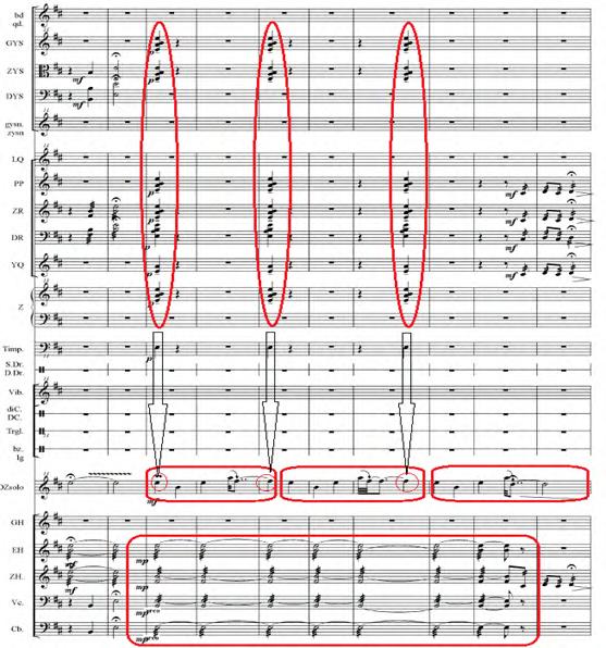 协奏部除了可以与主奏部配合,共同演奏旋律来达成特定音响效果之外,协奏部也可以直接演奏旋律,利用不同乐器组音色的变换,与主奏部单一音色产生对比,如第二乐段第二部分。这部分尽管协奏部演奏的与前面主奏部所陈述的旋律完全一致,但各乐器组分别演奏,犹如调色板一般,给同一段旋律赋予了多样的色彩,在音色上与之前主奏部所奏旋律产生对比,旋律重复但音响不显单调。