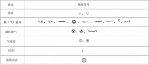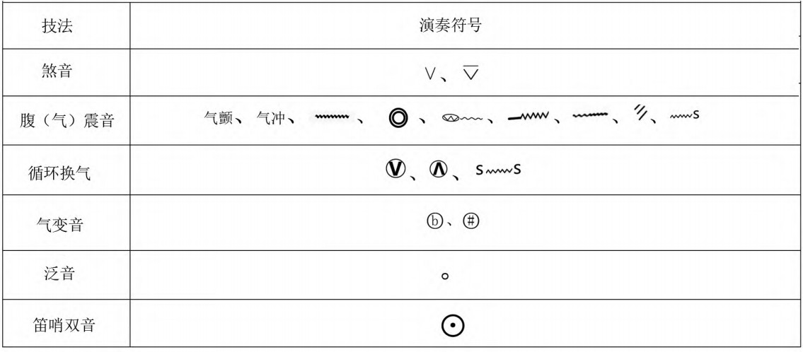 常用的气息类技法演奏符号一览表如下所示(表1)。