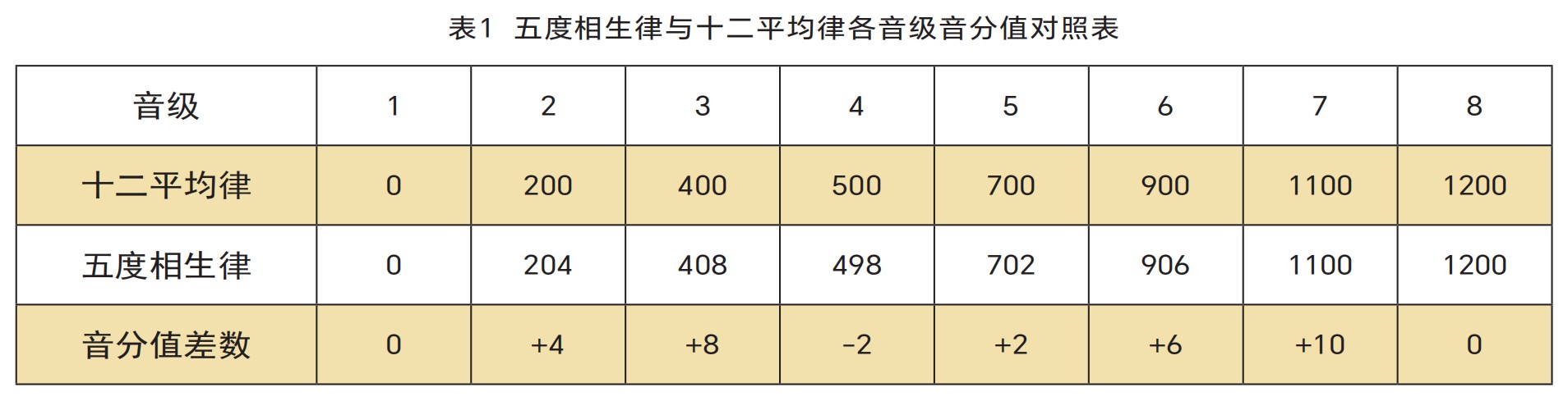 由表1可以看出,十二平均律与五度相生律在音程关系上存在根本差异:十二平均律由均一的十二平均律半音(100音分)及其叠加构成的全音(200音分)组成;而五度相生律通过连续纯五度生律,自然形成了由大全音(204音分)与小半音(90音分)构成的非均等音阶结构。前面已经说过,由于两种律制产生的方法差异,才造成音程关系的不同。