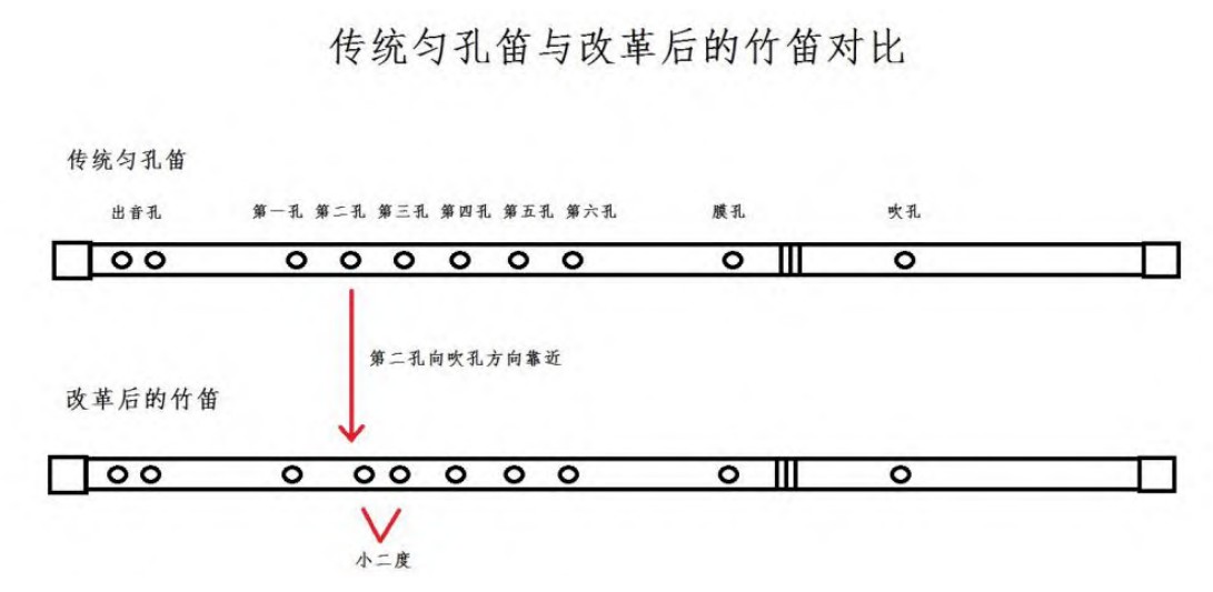 传统竹笛的音孔距离是平均的,需要演奏者用气息或手指对音高进行调整,以达到演奏不同音阶、音高的目的。经过改革六孔竹笛(即现在全国各音乐大专院校通用的竹笛) ,将第二孔的开孔位置更靠近吹孔,使第二孔与第三孔的音程距离拉小, 成为小二度,在其它音孔的位置上也有细微的调整,使演奏者能够在同一支竹笛上方便地吹奏五种以上调式的大小音阶。竹笛作为中国乐器,在传统的演奏手法中,采用五度相生律较为适合。