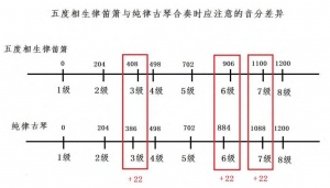 以上列举的是竹笛与十二平均律乐器合奏时的音高矛盾与解决方法,那么,当竹笛与纯律乐器(如:古琴)合奏时,这种音高之间的矛盾就更明显了。