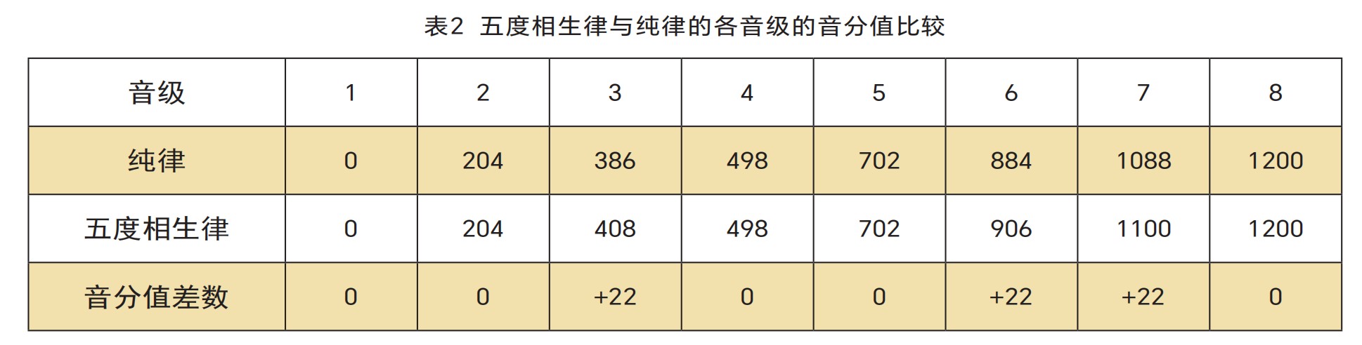 纯律亦称“自然律”,是在五度相生律的基础上扩展而成的律制。其构成方式是在八度(二倍音)与纯五度(三倍音)这两个纯正音程之外, 引入五倍音以构成更为纯正的三度音程。表二就是五度相生律与纯律的各音级的音分值比较。