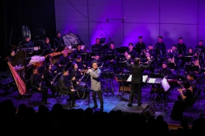 本场敲击乐声部的演绎呈现专业功底,演奏家们精到把控鼓、镲、锣等乐器的音色层次:轻敲清脆如珠落玉盘,重奏雄浑如雷霆万钧,轮奏、滚奏技法运用自如。 既为吹管旋律搭建起节奏骨架,又以独有的音色质感形成独立的音乐表达,在全新编排下,《闹花灯》《欢送》留住了原生的乡土情韵与民间意趣,又被赋予更鲜活的现代律动与结构美感,老曲新声、气象焕然; 终曲《祝贺》由张维良与钱青共同演奏,敲击和吹管两大声部交织推进,构成一场酣畅的“并进式对话”,将整场音乐会的情绪推向高潮,兼具民间吹打乐的热烈质朴与现代舞台的艺术质感。
