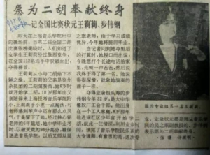 3岁开始随父亲学习二胡的王莉莉,并不知道“四人帮”是什么。年幼的记忆里,只有父亲一遍遍教她唱的曲调和胡琴拉响时的声音。“我父亲在江苏省戏校读书时,专业是板胡,学习豫剧,戏校毕业后分配在剧团”,既能演奏二胡又能兼作曲和指挥的父亲,出差演出时常常将她带在身边。乐团工作变得空闲时,父亲把全部精力放在教女儿学习二胡上。