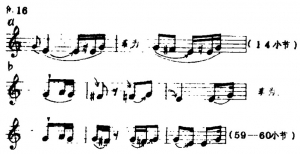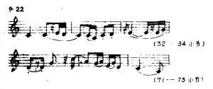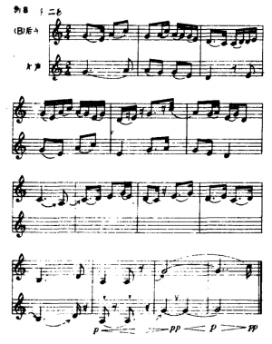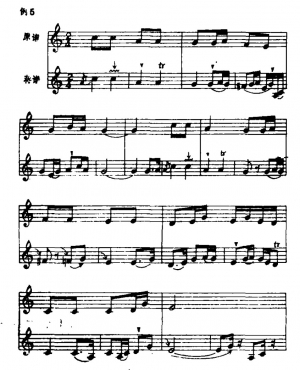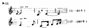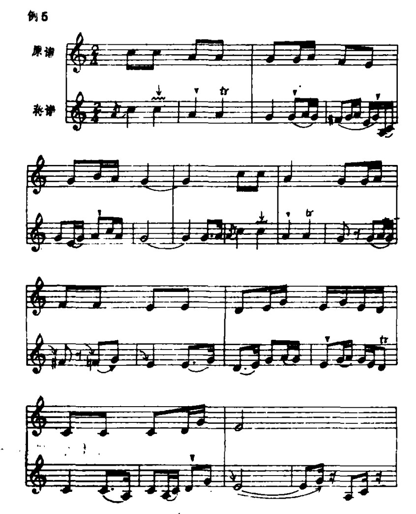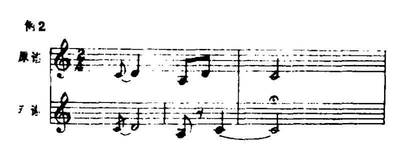 蒋风之先生的演奏谱与原谱在结构上亦有较大的变动。他将原谱中每小节以四分音符为一拍,扩充为两拍,一小节分裂成两个小节,这样速度虽比原曲加快了,但由于旋律的扩展及节拍的变化,演奏的实际效果却慢了许多。扩充后的乐曲,在节奏上增加了很多音符,因而使乐曲产生了新的变化与组合。见例1蒋先生演奏谱与原谱(A)对照:从例1可看出,旋律的扩展,节奏的变化,使音乐更加流动和丰满。此外,乐曲中变化音升Fa的出现及休止符的巧妙安排,使旋律更加委婉、缠绵,如诉如泣,增加了乐曲的艺术魅力。