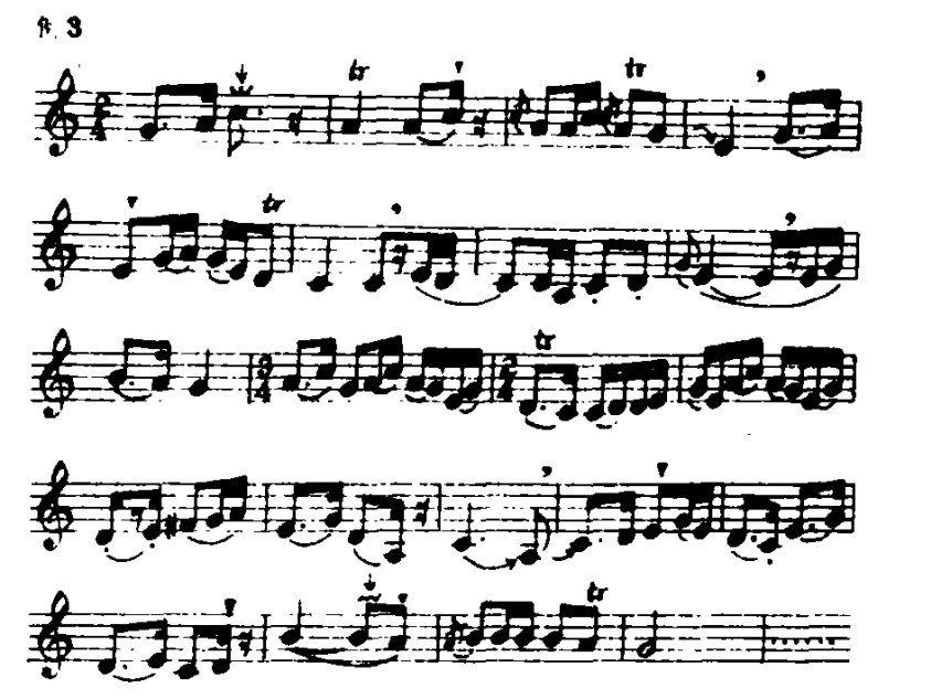 乐曲中多次出现的休止符或顿音,在用长弓演奏时,应做到似断似续、藕断丝连的效果(见例21)。