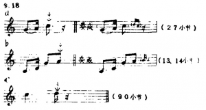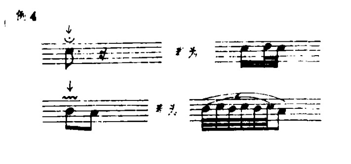 (3)压弦:由于二胡没有指板,所以在揉弦的基础上又派生出独具特色的压弦、压揉等手法。压弦是借鉴琵琶的推、拉演奏技法,并模仿其演奏的效果的。压弦时,在原音的位置上,用臂带动掌与指的力量,将弦压至所需要的音高位置,然后再松回到原音,一般为先压后松(见例18a)、先松后压(例18b)或直接压至所需要的音高(例18c)(见例中标记↓的音)。