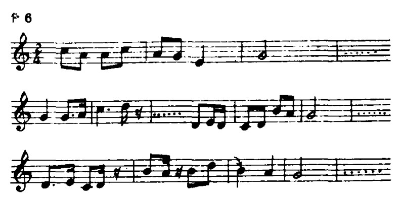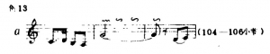 从谱面上不难看出,在优美徐缓的旋律中,顿、挫所起到的特殊魅力,它将旋律分割成不规则的句读(请注意上例中第4、6.