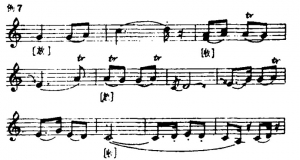 4.偏低音的具体用法:这里谈的所谓“偏低”,即前文所述揉弦手法的“低不准”步骤之一。这样处理,是为显示出此音较明显的倾向性,使旋律进行求得稳定。这个音一般是不揉弦的,而后一个音出现时则需用揉弦手法。这种手法还可能用于由强转弱(例20a)、由不稳定到稳定或两拍的前一拍(例20b)及包含有低加花音(例20c)的旋律中。