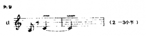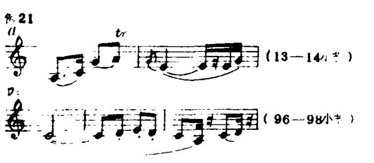 (1)滑音:本曲在滑音时,一般不强调过渡音,如下滑音re→si,演奏时re、si各用半拍时值,这样才能做到滑而不腻,但有时滑音中间也包含有过渡音,蒋先生的演奏处理如下例: