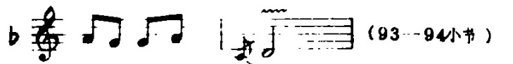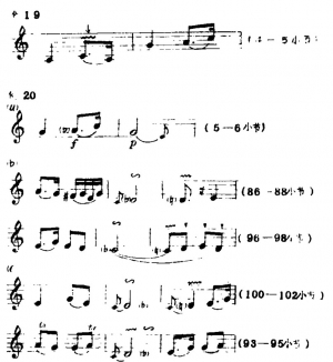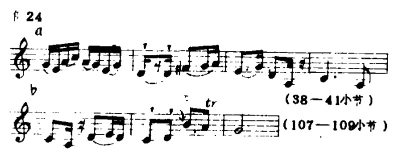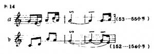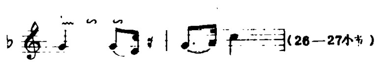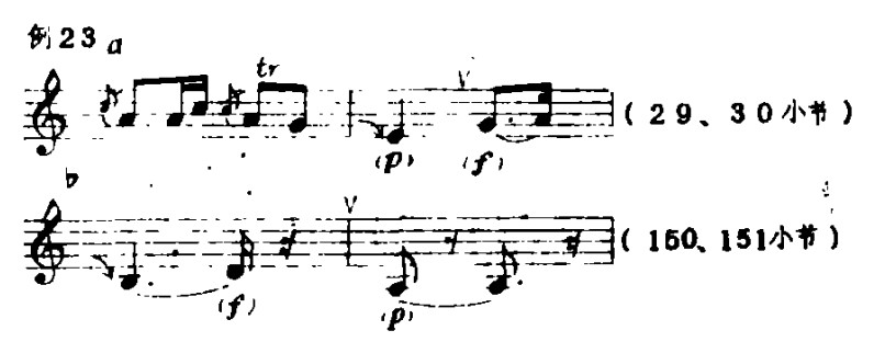 3.提弓(将弓子轻抬离琴筒)的运用应恰到好处,它使乐曲在进行中出现顿、挫的效果。有时,由于情绪需要转折变化时,也出现这种弓法。提弓在本曲中的应用一般有两种(标记为“V”):例23a是结束前一拍音,后一拍音为强起,例23b是强结束而后弱起。