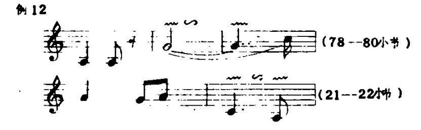 第三段(C):旋律发展中几次出现了较激昂的音调,音域相对偏高(见例6)。