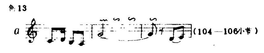 (5)旋律进行中的气口以及句子的结束时,情绪上要求平稳清淡,随后又要求较浓的色彩变化时,一般在第一拍的前半拍揉,后半拍不揉,第二拍或延续到第三拍时都不揉。同时右手用提弓的弓法来配合。如例13: