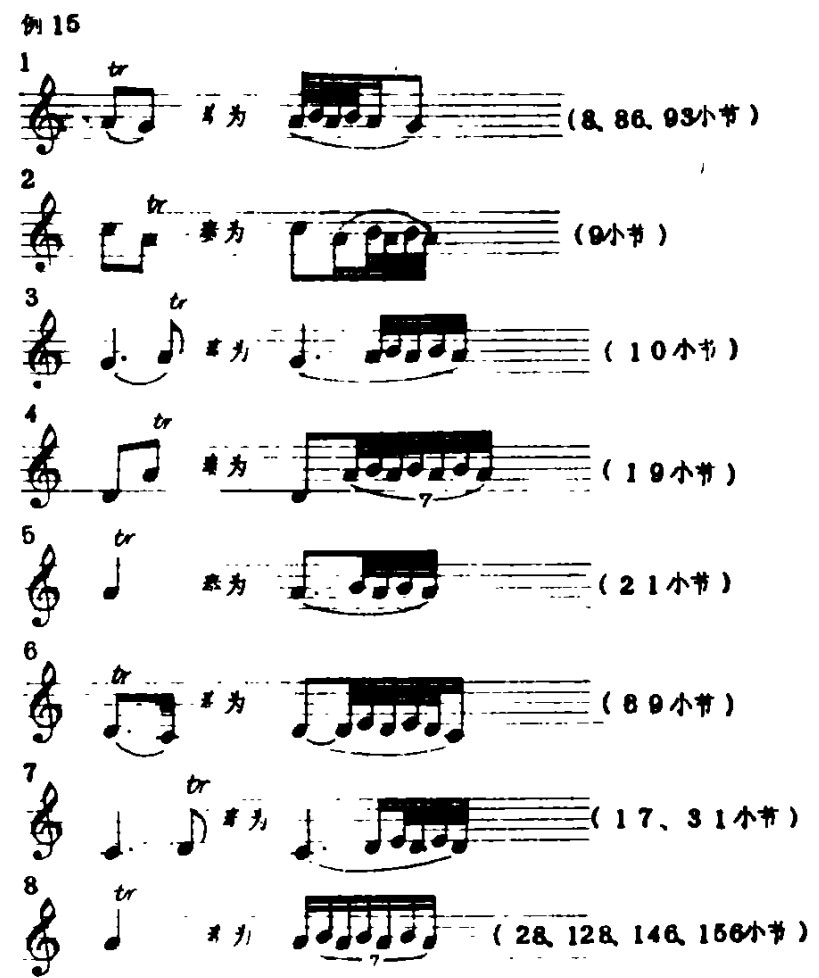 在本曲中颤音的运用多在二指上。如里弦的re、外弦的la,演奏时要结合乐曲本身的情绪及前后音符的有机联系,同时,颤音又是构成音乐旋律的内在音(即:清楚地表示出旋律进行的来龙去脉)的因素之一。如例15:
