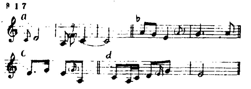 (2)虚按音:即左手按指在弦上,但右手运弓时,配合提弓或松弓,并不将此音奏出实音效果。在本曲中,虚按音能果断地结束前一个音,并为后一个音做准备(例17a、b括号中的音),或能起到加花音(17c.d括号中的音)的作用。