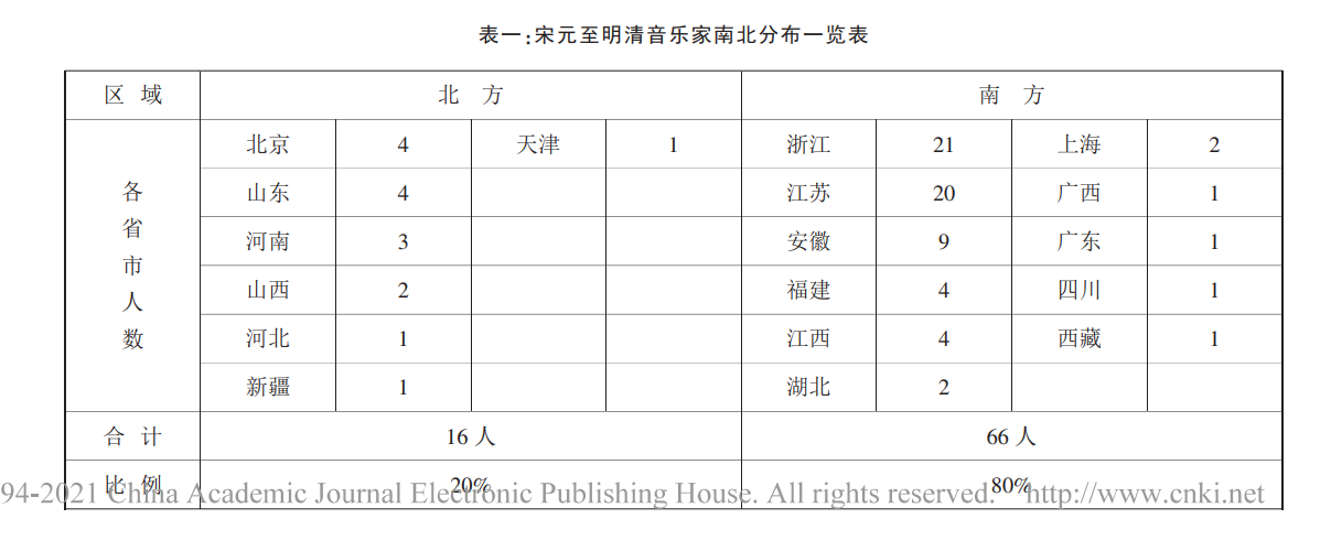 从表中可以看出,82 位音乐家中,籍贯在江南地区的就占了 43 位。一个地区音乐人才的数量的多少与艺术水准的高低,可以直接反映这一地区音乐文化的发展程度。从上表可以看出,江南地区的音乐文化比中国其它地区更为发达。明清以来,江南地区出现的众多音乐理论家、演奏家在中国音乐史上都占有非常重要的地位。在明清时期出现的琵琶艺术的高潮,更是以江南出现的众多流派及演奏名家为标志。到 20 世纪初,传统音乐人才依然是南多北少的局面。