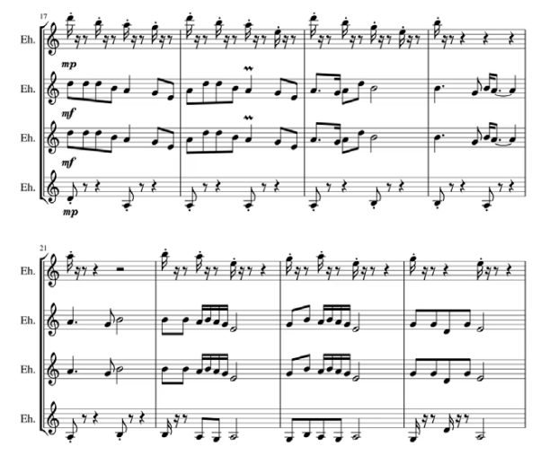 在乐曲的17~24小节,一声部与四声部都以跳音的技法演奏。一声部演奏的音区处于旋律线条之上的高音区,通过高音区的短促音符来作为旋律的调色,为线条状旋律增加明亮、跳跃的色彩,所以在演奏时需要右手手指对弓毛的弹性力来控制弓子。而四声部的跳音位于低音区,作为旋律线的支撑,需要演奏员右手手臂的稳定力量来演奏跳音。
