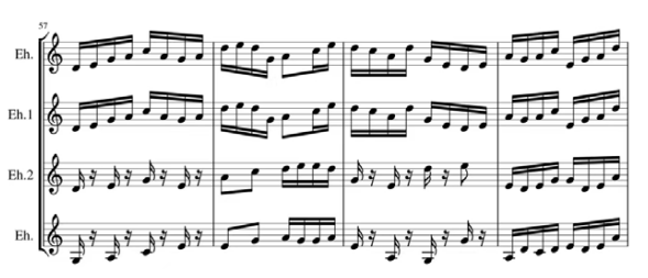 以乐曲57小节为例,高胡、二胡1声部同度演奏旋律,二胡2与中胡则以短促的十六分音符点出旋律重音。这样点线交织的重奏织体需要四个声部演奏员间的默契配合。对于点重音式的演奏,要求演奏员右手手腕带动前臂拉出瞬间的爆发力,同时控制弓段的长度在较短的范围之内,这样可以达到在有爆发性的同时,又不会让音量过强,干扰到主旋律的主导地位。