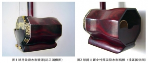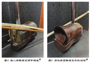 琴筒后端扁圆形出音筒设一硬木制心型挡板(见图4),且向琴筒内侧倾斜,这一部件在增强了声音的反射效果、有效增加音量的同时,也使声音聚拢在琴筒内,不会完全扩散出去。如此以来,胡琴类乐器中下把位常见的声音衰竭现象得到有效改善,中下把位在音色上更加醇厚、明亮。以当前苏州民族管弦乐团高胡声部为例,十把高胡音量在整个乐队中已经基本可以满足乐队需要,有时甚至要稍微控制一下音量。这款改革高胡整体在音色上细腻,情感表达较以往高胡更加丰富。