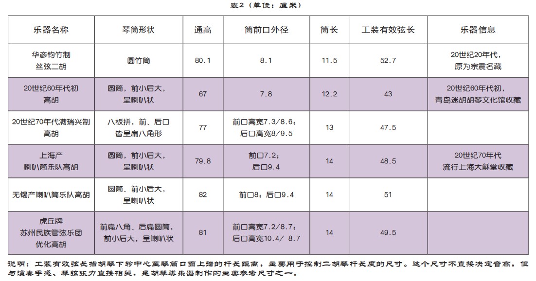 为了了解高胡乐器形制的百年史,笔者整理了包括早期二胡在内的6把各个历史时期不同高胡的常用参数(见表2):20世纪20年代华彦钧竹制丝弦二胡、青岛迷胡胡琴文化馆收藏的一把60年代初的高胡、70年代满瑞兴、王国潼等合作研制的制高胡、上海地区现常用的高胡、无锡产喇叭筒高胡和苏州民族管弦乐团与苏州民族乐器一厂合作改良的高胡。通过对比,可以看到,高胡自诞生以来各个重要历史节点中的形制样态变化中,前小后大的喇叭筒式琴筒形状有利于音量的扩大,几十年来在高胡改革形制中接受度较高,而扁八角的形状在擦弦点与琴马之间的距离上小于圆筒,有利于高把位音区的音色。