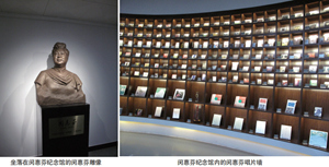 “闵惠芬艺术中心”置两尊闵惠芬铜像。闵惠芬胸像位于“闵惠芬艺术馆”入口。闵惠芬全身像置于“闵惠芬音乐厅”入口,铜像造型灵感来自闵惠芬演奏河南风格作品《红旗渠水绕太行》时纵横开阖、洒脱大气的舞台风采。以闵惠芬创作于2004年的诗词《乐志随想》 “神接天宇之气,韵含山河之风。情寄万物之灵,乐映千古之源”为背景墙,该诗既是闵惠芬个人的艺术宣言,也是生生不息的中国民乐的艺术宣言。那彰显闵惠芬艺术精神的铜像及诗作给新落成的“闵惠芬艺术中心”以灵魂。
