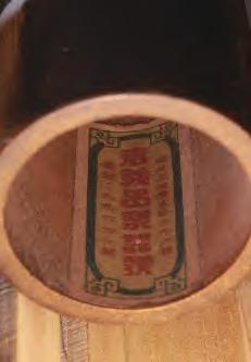 特别值得关注的是李磊石藏琴。李磊石是20世纪中叶上海显赫一时的乐器收藏家。北京的马良正、史善鹏、洪广源等都曾为他修缮和推荐老琴,赵济羹、杨宝忠等京胡大家也是他的知音。李磊石藏琴但不拉琴,为了“养琴”,他聘请琴师轮番为其操奏藏琴。[8]56号京胡琴杆上刻“磊石先生杨宝忠赠”京胡,琴筒后面的“杨宝忠的印记、李磊石收藏章[杨宝忠制]”(见图5、图6)不仅显示了名家制作与收藏的价值,更体现了京胡作为文化纽带的角色,在制作者、演奏者、收藏者和观众之间架起了一座桥梁,构成了京剧文化生态的完整链条。