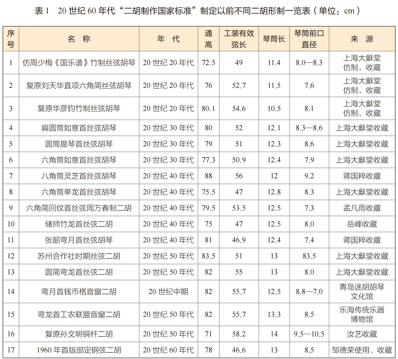 此次展出的二胡制艺作品,从时间顺序上以1960年轻工部颁发的二胡制作标准为节点,分为前后两个部分。从展出乐器的主要数据(见表1)中可以看出,琴筒的尺寸、形状、琴弦等对声音产生影响的要素,尺寸、数据各不相同(当然,琴弓的材质、重量、弓毛的多寡等也是影响拉奏手感和音色的重要因素,暂不在本文讨论之列)。本次展览的另一位策展人沈正国老师特别说明:“丝弦是专业厂家做的,且当时整个乐器制作领域对乐器音源的认识有限,乐器主体被看重,琴弦、琴码包括琴弓等均视为乐器配件,故没有列入标准。”③笔者查阅1959年中央轻工业部轻工业局颁发的《四种民族乐器质量标准(草案)》中《二胡制作标准》和1979年中华人民共和国轻工业部标准《民族乐器》中对二胡等级的划分,均没有对琴弦材质做出明确的要求。