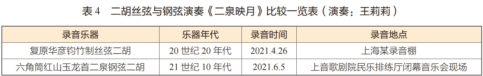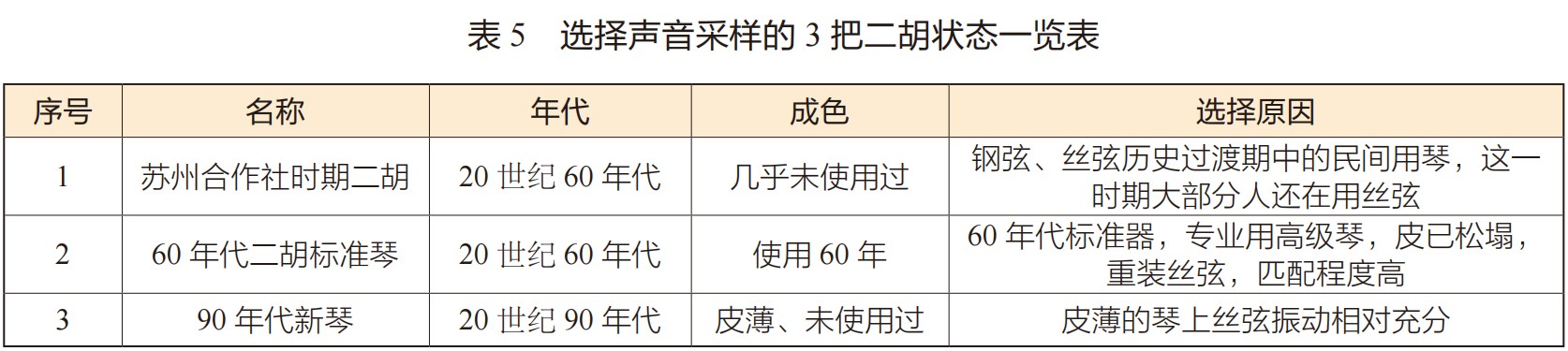 为了排除琴筒形状、尺寸、录音空间、设备等因素带来的音色差异,笔者设计了一个二胡声音采集实验⑳。考虑到丝弦—钢弦转换的年代、民间—专业用琴、不同琴弦品牌的受众面等因素,采样选用了展出中的3把二胡(见表5)。