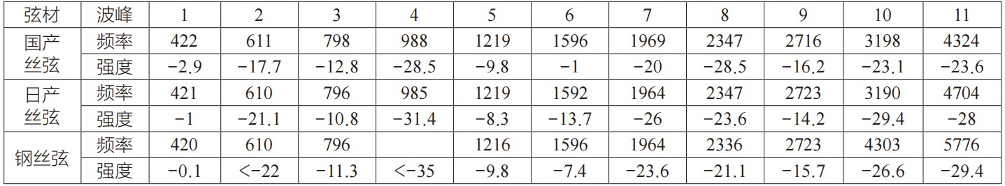 笔者借助Vagas软件(版本16。插件pazfrequencym,waves公司),结合人工读取音高的频率和强度数值,经过大量数据的对比分析发现,丝弦的高频泛音振幅整体强于钢弦。在钢弦第一波峰强度大于丝弦的情况下,丝弦的泛音强度反而大于钢丝弦。以1号琴外弦的空弦G音为例,三种材质琴弦的振动频率和强度(见图5),一共读取了10个波峰值。第一波峰的钢弦强度最强,为-0.1,而在后续的10个波峰中,只有1个(第8个)钢弦的泛音强度大于丝弦,其余均是丝弦强度大。