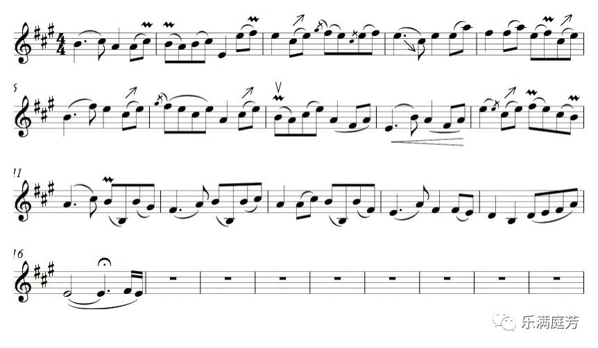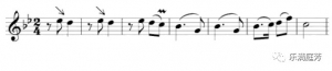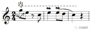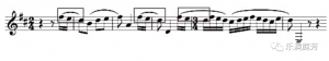 谱例1[3]三拍半的连弓表现唱之连贯(由于原调为1=#F,未避免在读谱中出现过多升号,故将其改为C调)