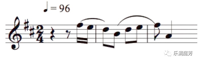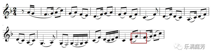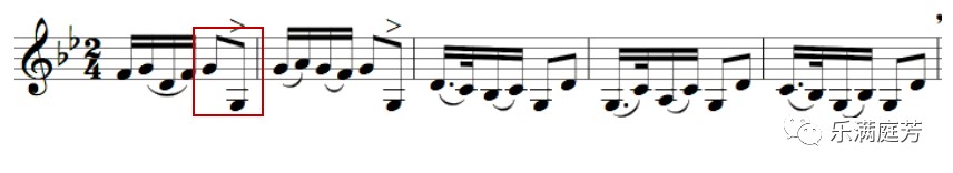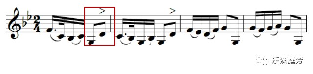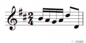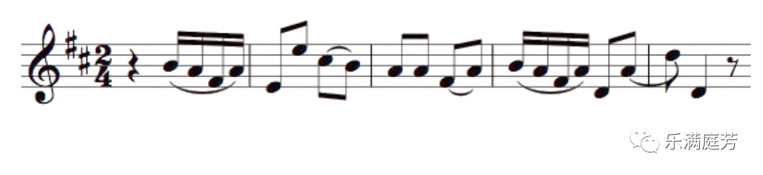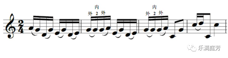 为固定音型,贯穿全曲。在弓法上是十分规整的、一拍一弓的拉奏。就在这“规整”之中,广东音乐常用旋法又悄悄显现,如多为眼起,弱拍多加花,重拍基本不加花,等等。