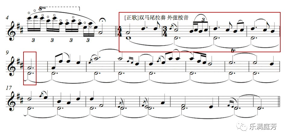 《人静安心》在第四段将前三段已有的音乐素材整合,并创造“双弓毛奏双音”[14]的方式模仿口琴复音的音响效果。“乐曲中既有广东音乐的味道,也有歌曲“牧羊姑娘”的味道。”[15]
