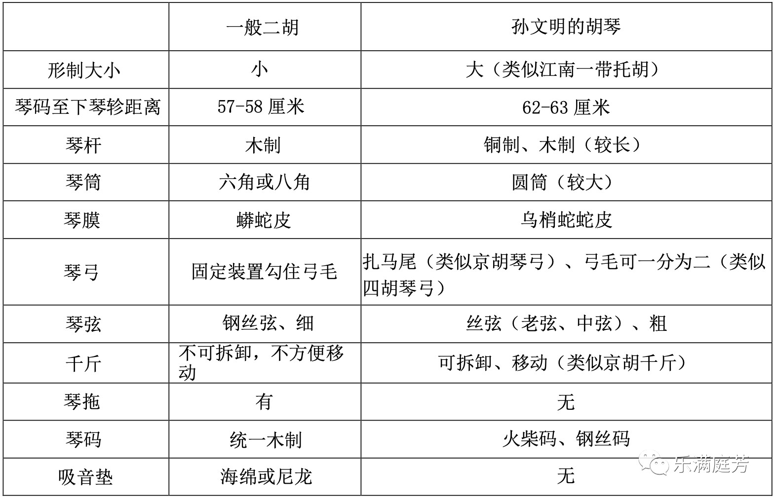 将两种二胡进行大致对比,通过表格可以一目了然地看出“孙文明胡琴”与“一般二胡”的异同。如表格10: