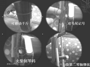 在孙文明四首乐曲:《送听》《二琴光亮》《志愿军归国》以及《人静安心》的第四段中,都运用了类似四胡双弦双马尾的技法,用短小细绳将马尾分为两束,当需要演奏双弦时,通过弓根扎马尾处,将马尾一分为二嵌入胡琴内外弦。
