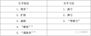 在运弓走指方面,孙文明也“创制”了许多特殊的“孙氏”技法,比如善用虚弓、弹弓;用指腹按琴弦;以及广东高胡双膝夹琴演奏方式,等等。主要包括五种左手技法和三种右手弓法,如表格12: