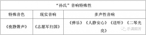 笔者首先关注的是孙文明作品中具有特殊音响的乐曲,包括《夜静箫声》《志愿军归国》《弹乐》《人静安心》《送听》《二琴光亮》。这6首曲目占孙文明全部作品的一半以上,乐曲中胡琴特殊音响在孙文明的音乐中扮演了重要角色。从而,本文试将其音色、音响特质划分为“特殊音色”“现实音响”以及“多声性音响”三个方面。如表格13:
