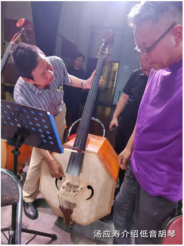 汤应寿介绍说:开始是以大提琴的琴箱为基础,做成葫芦形,琴头是如意头,做好后觉得音量、音色还是可以的,远看仍然类似大提琴,这与他的初衷相悖,故没有投放到乐团。