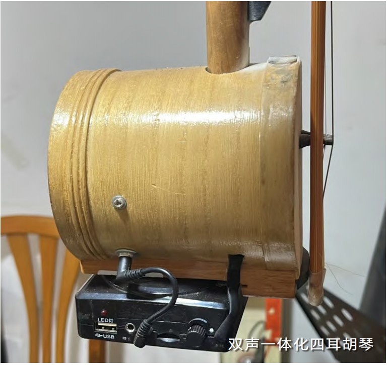 李鸿钧和汤应寿兴奋地表示:在传统乐器与现代科技融合的背景下,双声音一体化四耳胡琴以其独特的设计理念和卓越的功能性,创新性地将原声与电声融为一体,实现了两种声音的和谐共鸣,成为了音乐领域中的一颗璀璨新星。这款乐器的核心优势,首先方便演奏者轻松携带,无论是在室内、户外演出还是教学场所,都能轻松应对,极大地拓展了其使用场景,为现场演出增添更多可能性。更为引人注目的是;除了扩音功能外,双声音一体化四耳胡琴的扩音设备,还具备蓝牙和U盘播放功能,这一特性使其超越了传统乐器的范畴,对初学者来说尤为重要,他们可以通过专为四耳胡琴量身定做的教材和音频学习演奏技巧,提高试唱练耳、节奏感及演奏水平,为学习四耳胡琴提供了一个集演奏、播放、学习于一体的多功能音乐平台。同时,对于有一定基础的演奏者来说,伴奏音频的播放则能够为他们提供更加丰富多样的表演形式。无论是独奏、合奏还是伴奏,双声音一体化四耳胡琴都能轻松应对,为演奏者带来更加丰富多彩的音乐体验。